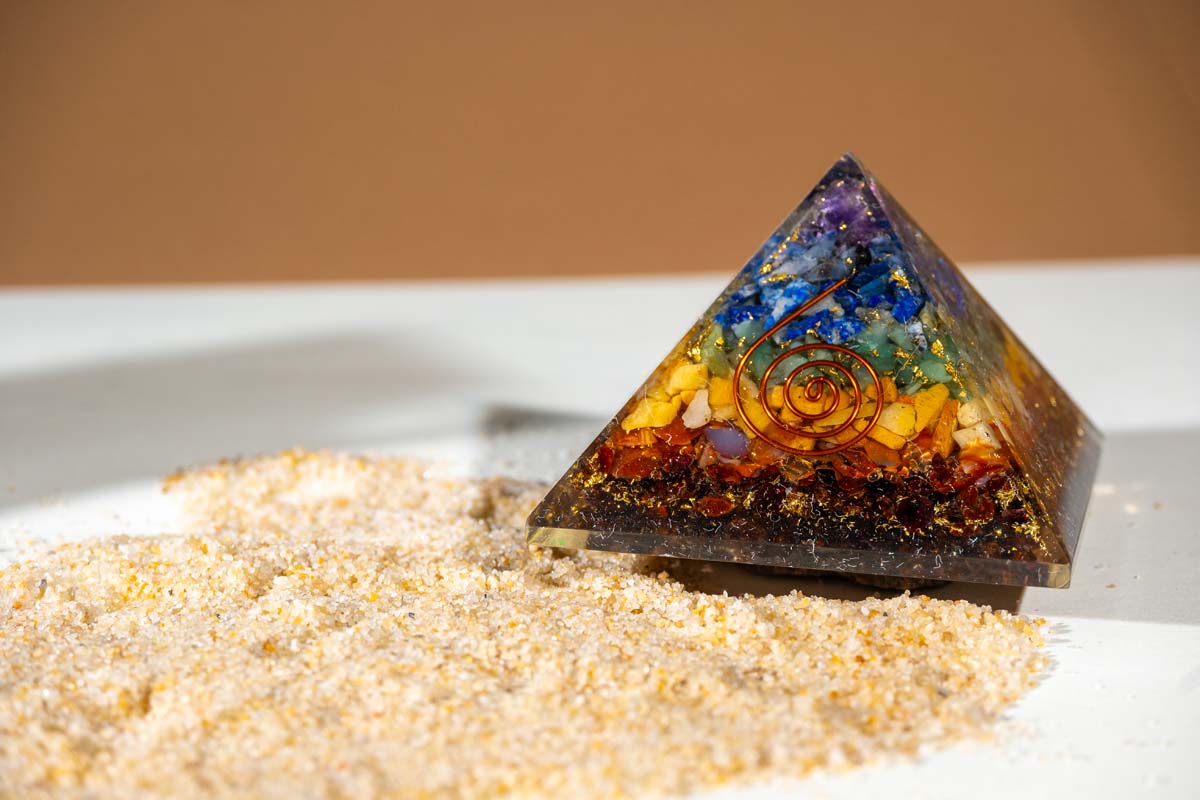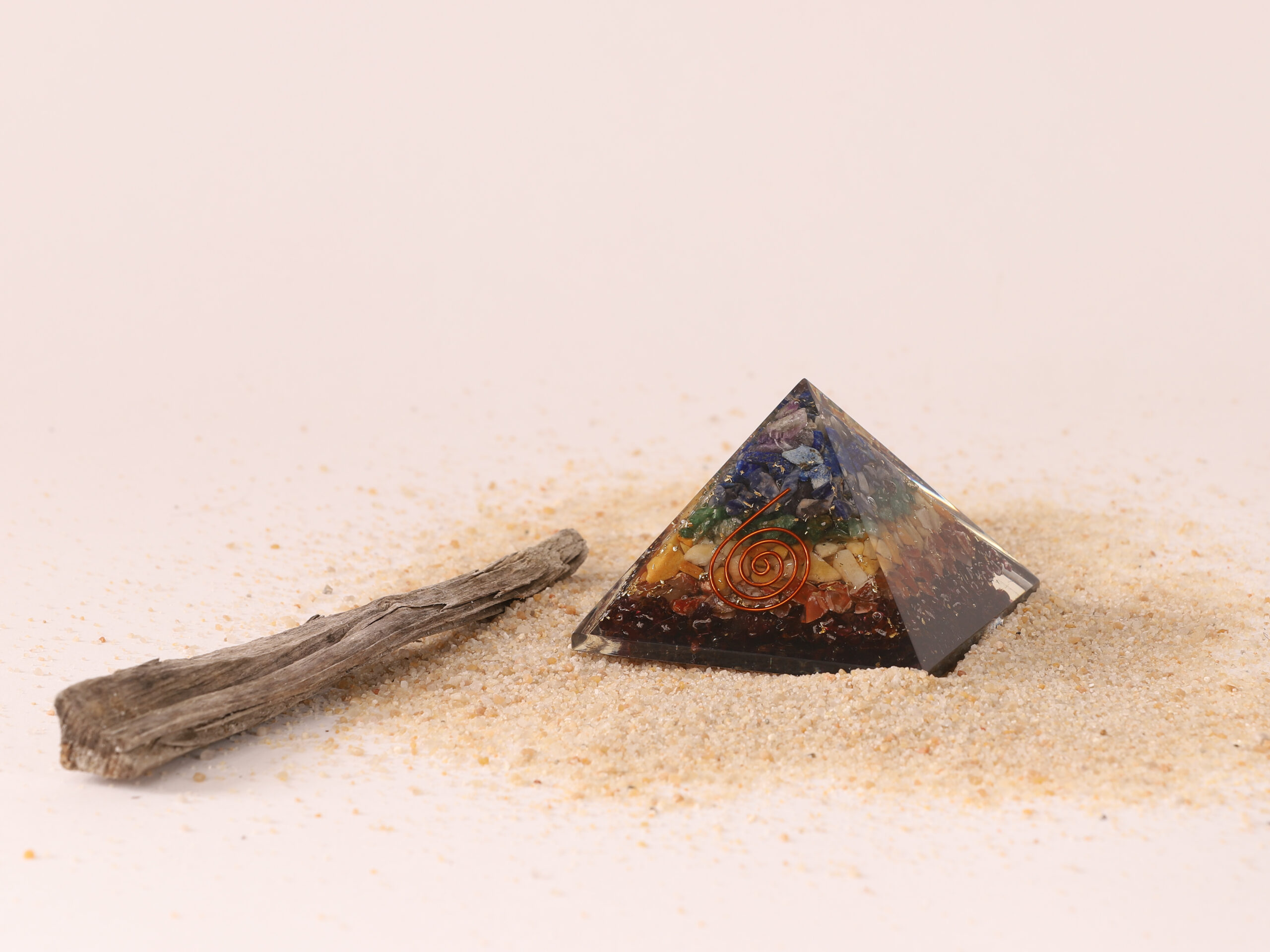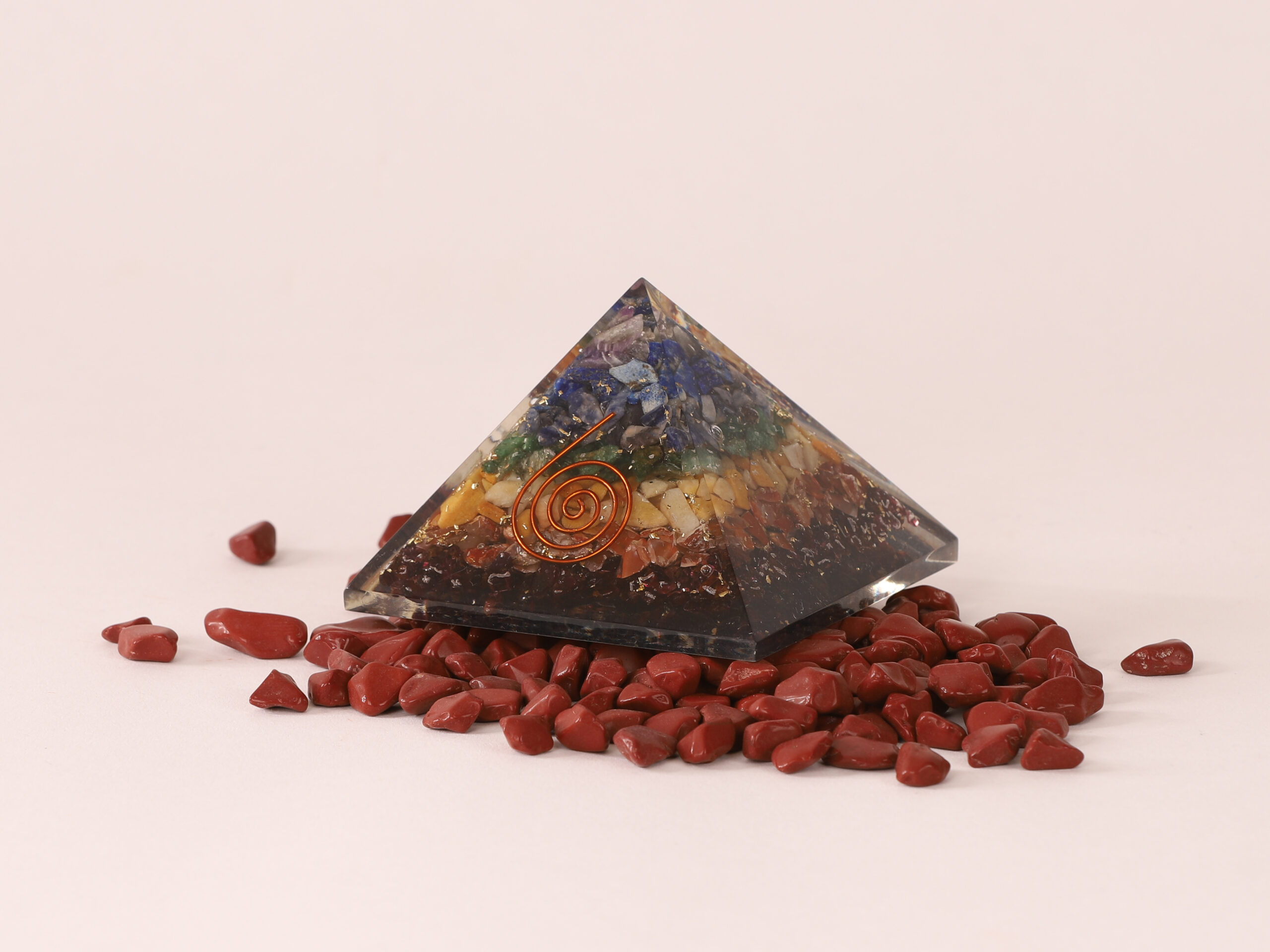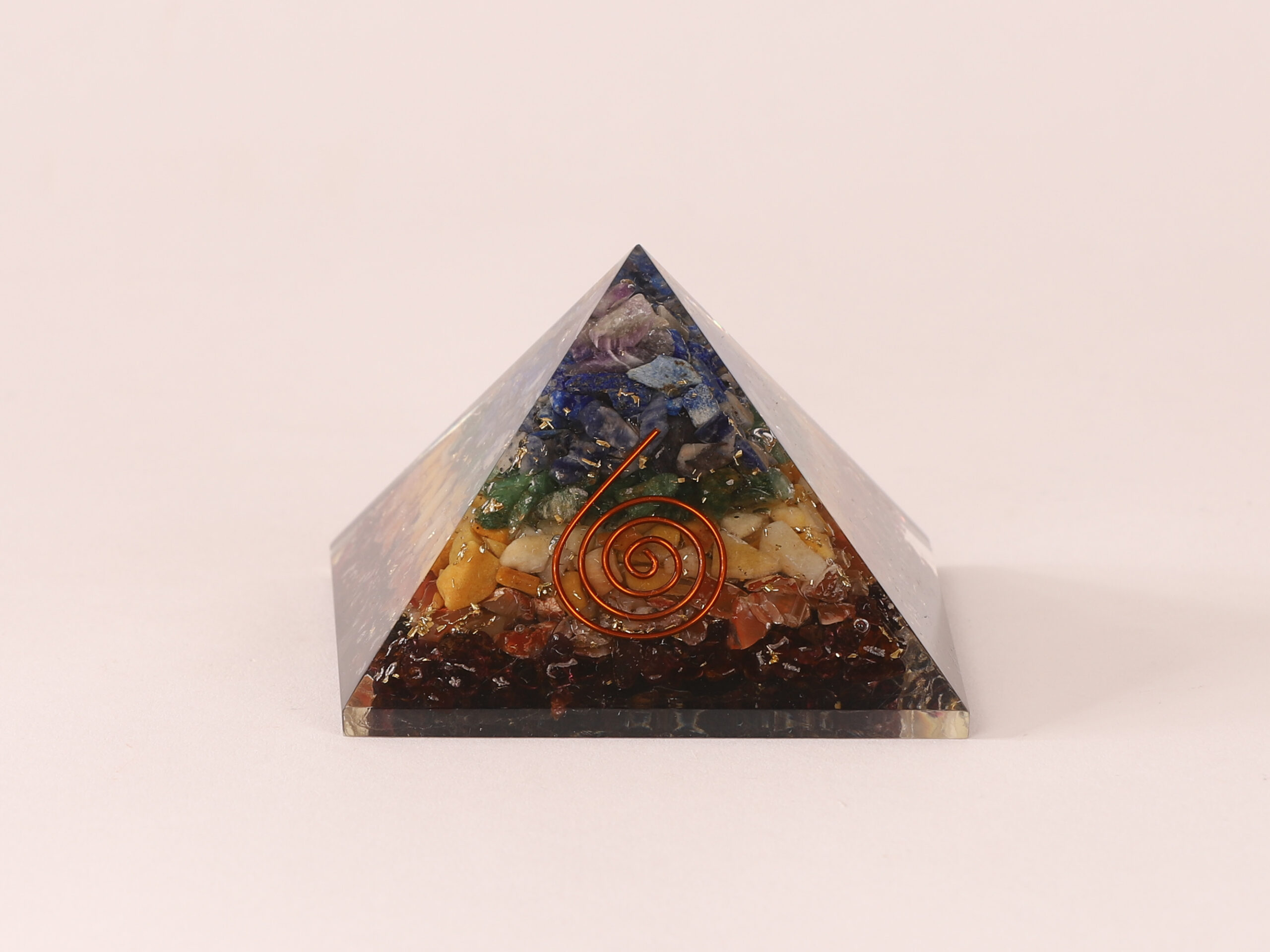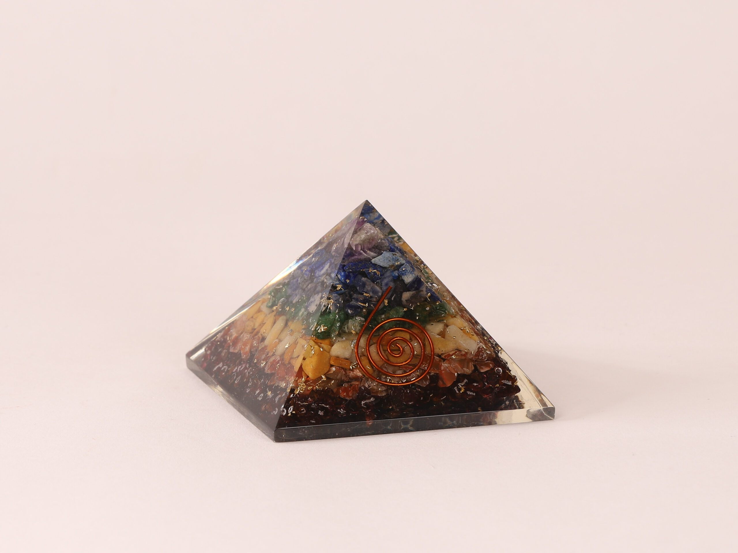 Cette pyramide d’orgonite 7 chakras est réputée pour ses propriétés purificatrices. Elle aide à éliminer les perturbations électromagnétiques et énergétiques, qu’elles soient géologiques, artificielles ou psychiques. Les pierres aux couleurs des 7 chakras favorisent également le nettoyage et le rééquilibrage de ces derniers.