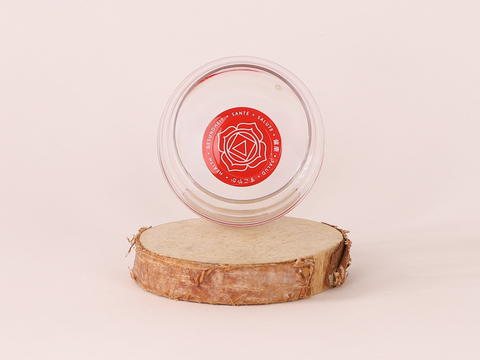 Verre énergisant soufflé sans plomb incrusté du motif Chakra racine. Ces verres sont fabriqués sur la base de notions énergétiques favorisant la modification positive de la structure de l’eau, qui de ce fait serait revitalisée, ainsi que le chakra correspondant.
