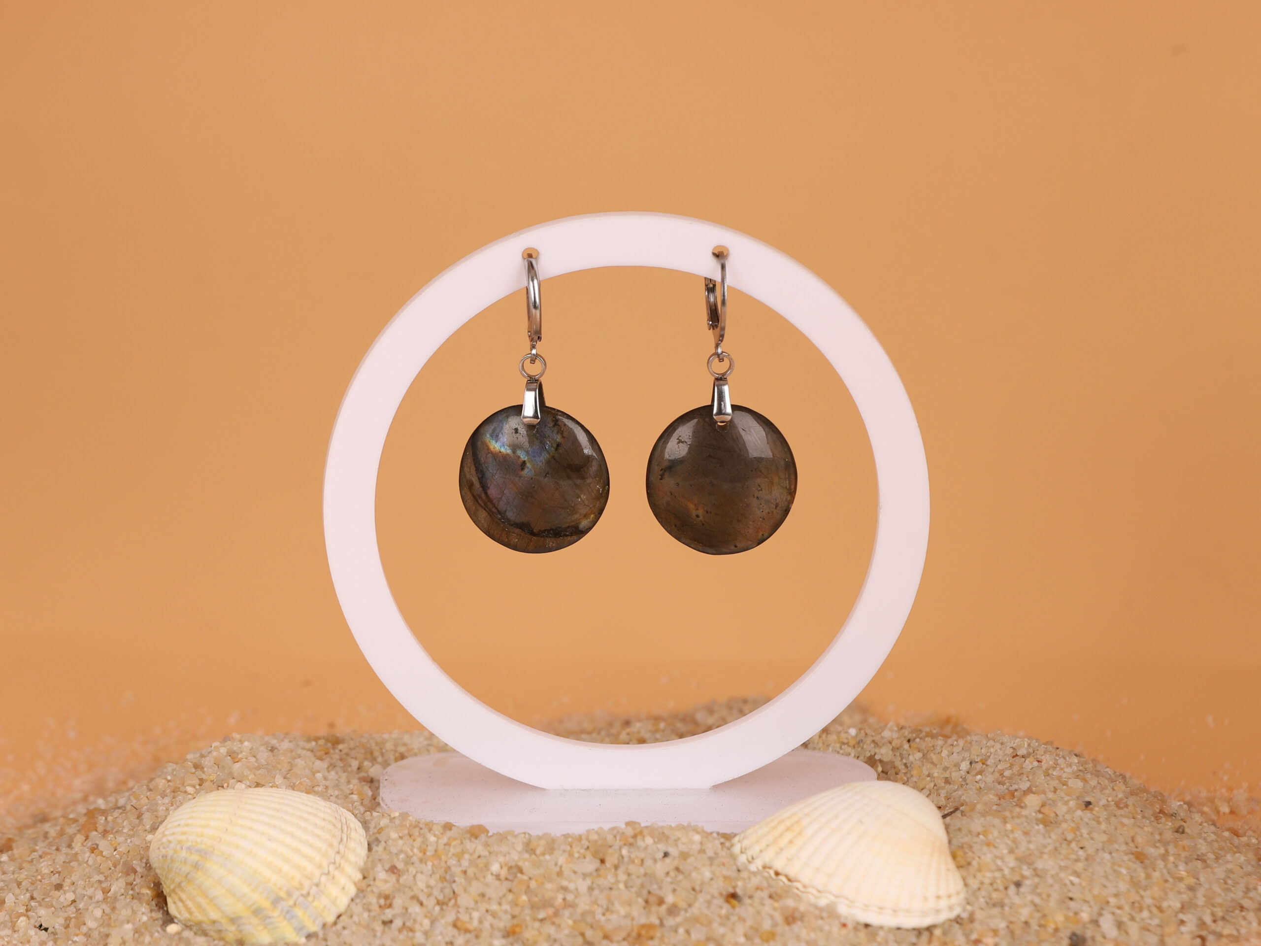 Boucles d’oreilles cercle Labradorite arc-en-ciel attache ronde