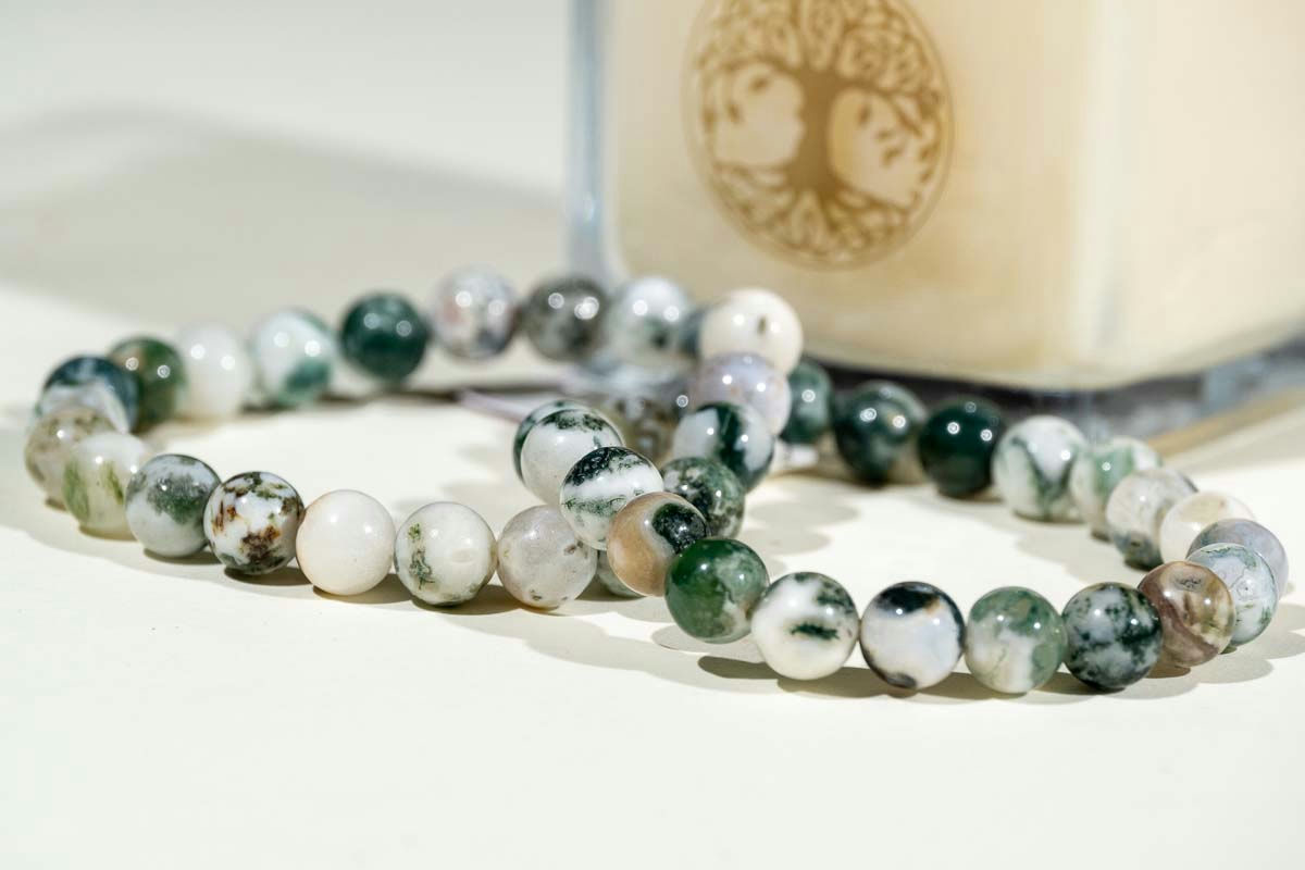 Ce bracelet en Agate Arbre de qualité supérieure et d’une magnifique couleur verte nuancée de blanc, est conçu pour offrir bien-être et harmonie. Ce bracelet est réputé pour ses vertus d’ancrage et de persévérance. L’Agate Arbre renforce la confiance en soi et procure un sentiment de sécurité intérieure, tout en apaisant l’agitation.