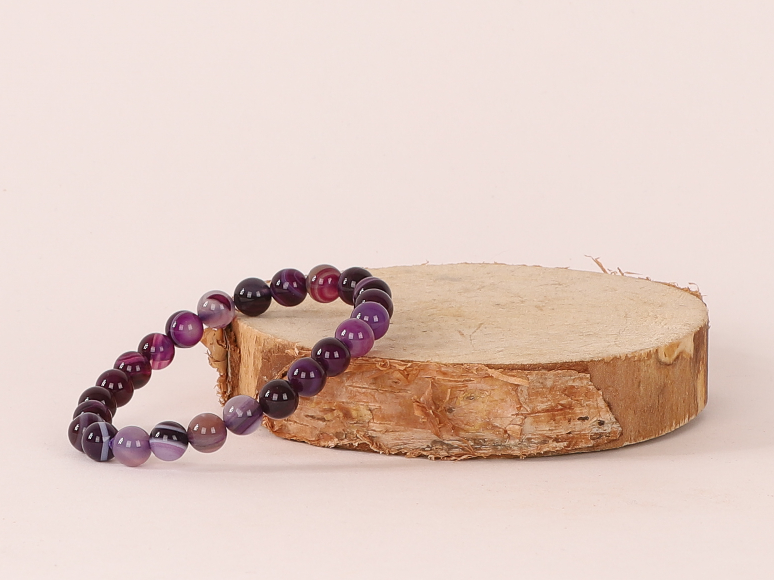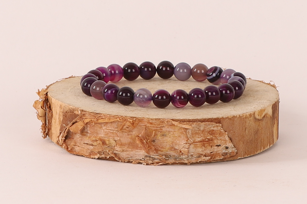 Ce bracelet en Agate Violette, composé de pierres de 8mm aux teintes profondes et élégantes, mesurant environ 18cm, est conçu pour apporter équilibre et apaisement. Depuis l’Antiquité, l’Agate Violette est associée à la spiritualité et à l’intuition. Ses nuances vibrantes symbolisent la sagesse et la clarté mentale, lui attribuant des vertus de protection et de sérénité. Reliée à l’énergie du spirituel, l’Agate Violette aide à calmer l’esprit, à renforcer la concentration et à cultiver une harmonie intérieure. Ce bracelet en Agate Violette offre un profond sentiment de paix et de bien-être au quotidien.