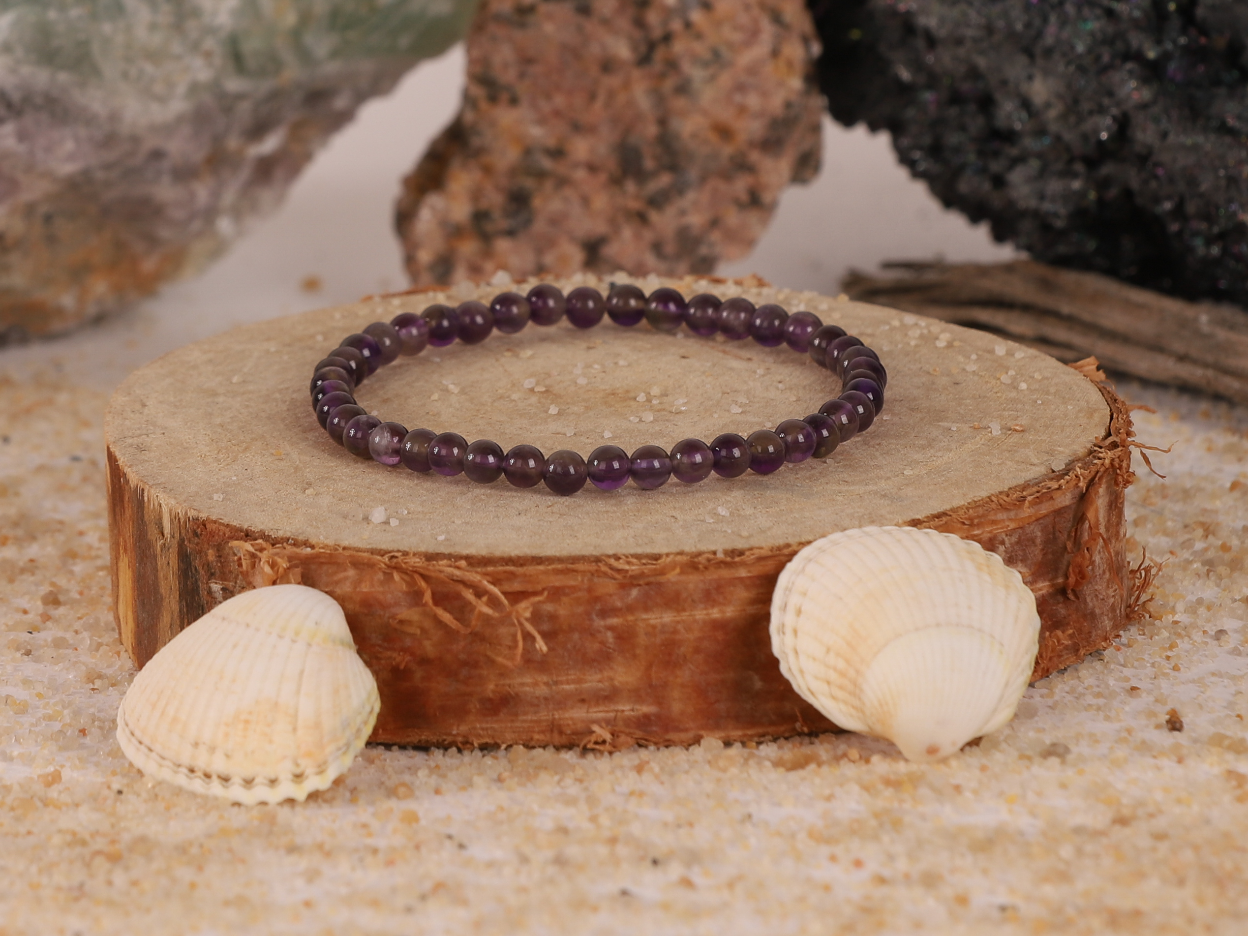 Ce bracelet en Améthyste ‘Dark’ de qualité supérieure, avec ses perles rondes d’un violet profond et transparent, est conçu pour favoriser le bien-être et la tranquillité. L’Améthyste, pierre de sagesse, est réputée pour apporter clarté mentale et élévation spirituelle.