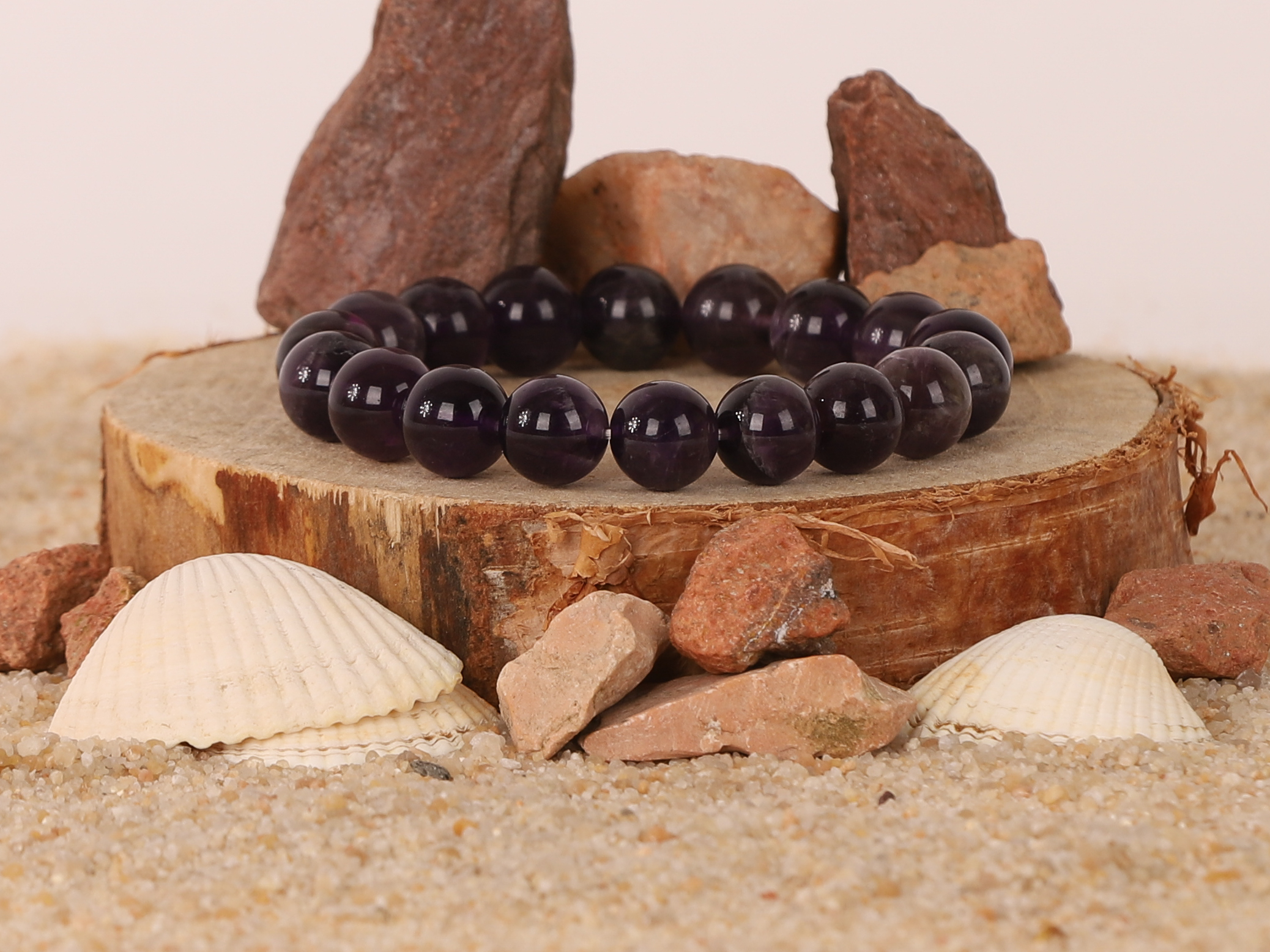 Ce bracelet en Améthyste ‘Dark’ de qualité supérieure, avec ses perles rondes d’un violet profond et transparent, est conçu pour favoriser le bien-être et la tranquillité. L’Améthyste, pierre de sagesse, est réputée pour apporter clarté mentale et élévation spirituelle.