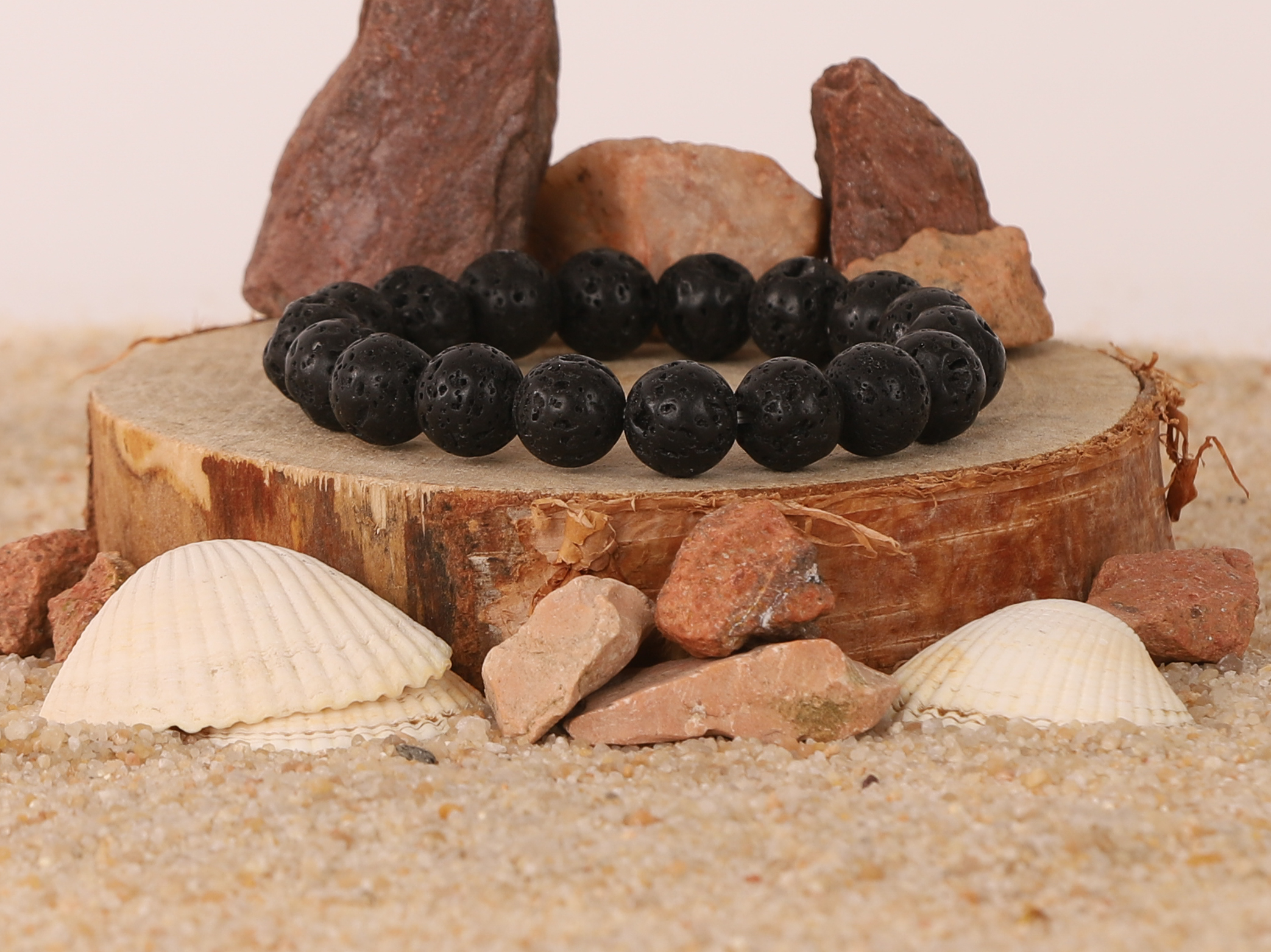 Ce bracelet en Pierre de Lave, d’une taille d’environ 18cm et avec des pierres de 10mm, émerge des profondeurs de la Terre mère. Connue pour sa puissance, cette roche volcanique symbolise notre lien indéfectible avec la nature, nous permettant de nous ancrer davantage au quotidien. La pierre du bracelet incarne force et protection contre toutes les malveillances. Sa couleur noire élégante, légèrement délavée, présente des aspects irréguliers qui reflètent la solidité du minéral.